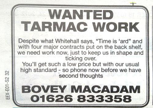 It’s a great ad. Most people would be scratching their head forever and a day, faced with the prospect of selling tarmac in the small ads.
